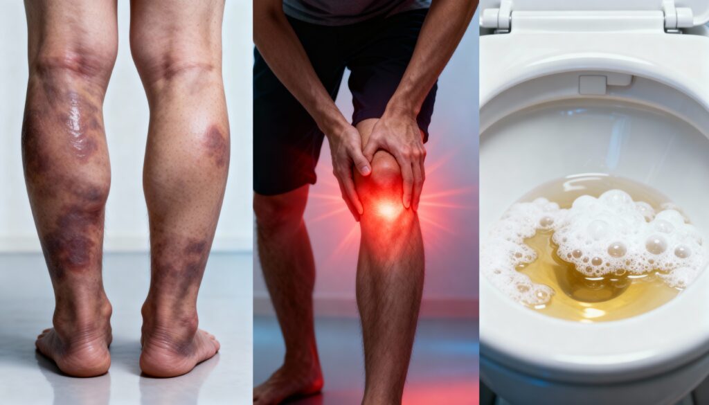 ✔️ Albumina na urina (albuminúria), sinal claro de que o rim está “vazando” proteínas;