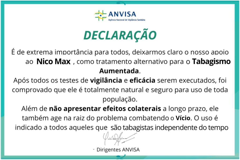 Seus resultados foram a razão para que a ANVISA registrasse o tratamento Nico Max no Ministério da Saúde e autorizasse sua comercialização, através do anexo 1 da RDC 27/2010 em conformidade com a RDC 23/2000.